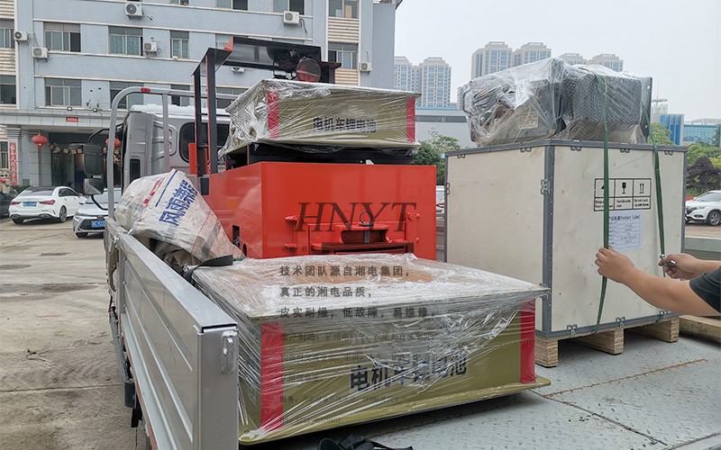 河南客戶采購的一套礦用2.5噸鋰電池電機(jī)車裝車發(fā)貨,由專車直送礦山。